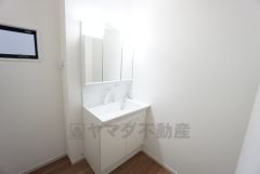 三面鏡にハンドシャワー付きで使いやすい洗面台です^^鏡裏と洗面ボウル下に収納付きの洗面台なので、整理整頓ができスッキリと使えます^^