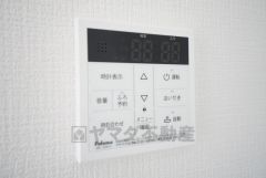 キッチン横からお湯張り、追い炊き、足し湯がボタン一つで楽々操作できる給湯機リモコンです^^忙しい夕飯の準備の時間帯に重宝しますね。