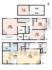 LDKは17.5帖、リビング部分は折り上げ天井・ダイニング部分には吹抜けあり^^ 2階には3洋室、主寝室は約10.7帖WIC付き^^約6.1帖の洋室にはWIC&ロフト付き^^