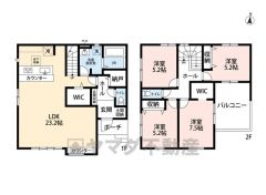 LDKは広々23帖以上^^2階には4洋室、全居室十分な広さを確保^^リビングと主寝室にWIC、玄関に納戸・土間収納付き^^