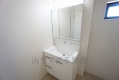 三面鏡にハンドシャワー付きで使いやすい洗面台です^^鏡裏と洗面ボウル下に収納付きの洗面台なので、整理整頓ができスッキリと使えます^^