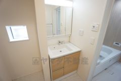 三面鏡裏収納付き洗面化粧台です^^ 歯磨きセットやスキンケア用品などの収納に便利ですね。