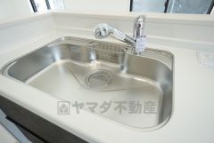 大きなお鍋も楽々洗える幅の広いシンクです^^ステンレスシンクなので簡単にお掃除できますよ。洗剤やスポンジもすっきりできる収納付き。
