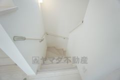 踏み場の広い手摺付き階段です。勾配も緩やかに設計されており、高齢の方でも安心できますね^^