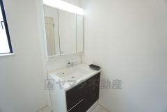 三面鏡にハンドシャワー付きで使いやすい洗面台です^^鏡裏と洗面ボウル下に収納付きの洗面台なので、整理整頓ができスッキリと使えます^^