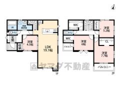 4LDK 1F:LDKは広々とした19帖の開放的な空間と1洋室 2F:3洋室、2WIC、大容量のファミリークローク付きで収納充実