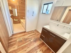 三面鏡にハンドシャワー付きで使いやすい洗面台です^^鏡裏と洗面ボウル下に収納付きの洗面台なので、整理整頓ができスッキリと使えます^^