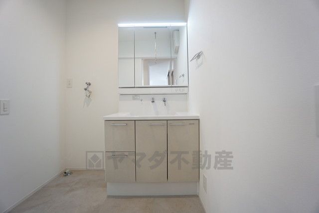 三面鏡つき洗面台。収納も一体型になっているので、ドライヤーやヘアアイロンの置き場に困りませんね。