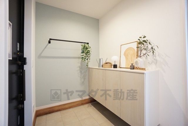 アクセントクロスと白を基調とした開放感あふれる玄関です^^ステキな玄関で帰ってくるのが楽しみになりそうですね^^シューズボックス付きなので、家族全員の靴がきれいに整頓できます。