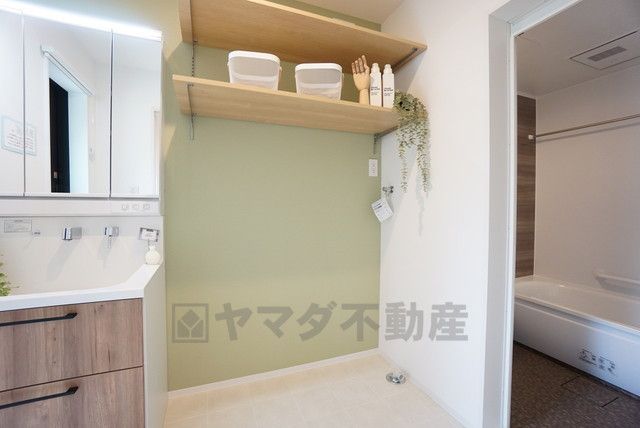 三面鏡裏収納付き洗面化粧台です^^ 歯磨きセットやスキンケア用品などの収納に便利ですね。