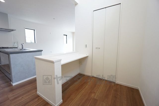 キッチン横にはスタディーカウンターとウォークインクローゼット付き。 お子さまの勉強スペースや作業の場、家事の合間の一息休憩にも^^ 物が沢山集まりがちなリビングに収納スペースがあると便利ですね^^
