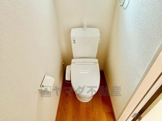 温水洗浄機付トイレです。節水機能もあるので、安心して使えますね。もちろん、1階2階の2ヶ所にトイレがあるので、忙しい朝にもゆとりができますね。