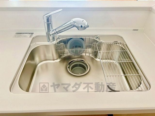 広々としたステンレスシンクには、洗剤やスポンジを収納出来るラック付き。広さも確保しているので、大きなお鍋も洗いやすいです。