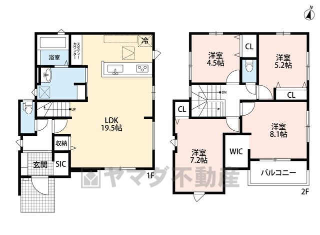 LDK19.5畳(1F)、洋8.1畳(2F)、洋7.2畳(2F)、洋5.2畳(2F)、洋4.5畳(2F) |