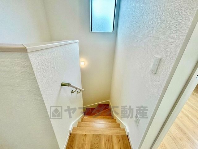 小さなお子様やご高齢の方でも安心できる、手すり付き階段。段差も低めで設定されており、安全性にも優れています。