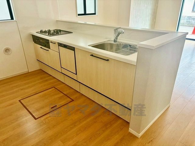 食事の後の手間を解消する食器洗い乾燥機付。冬場の洗い物で手荒れの悩みもなくなります。手洗いよりも節約できて便利。