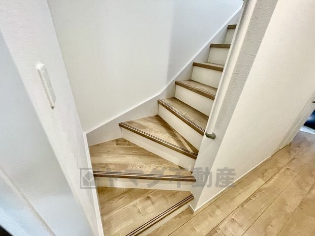 小さなお子様やご高齢の方でも安心できる、手すり付き階段。段差も低めで設定されており、安全性にも優れています。