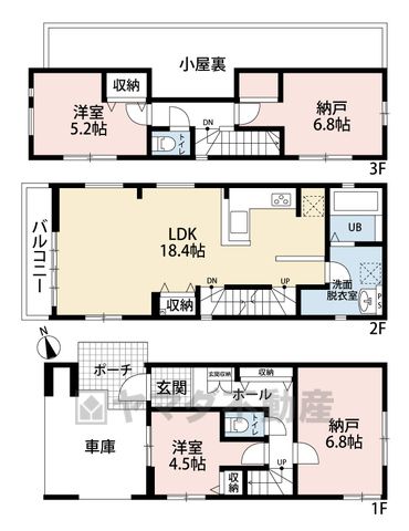 洋4.4畳(1F)、その他6.8畳(1F)、LDK18.4畳(2F)、洋5.2畳(3F)、その他6.8畳(3F) |