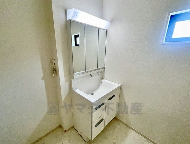 三面鏡にハンドシャワー付きで使いやすい洗面台です^^鏡裏と洗面ボウル下に収納付きの洗面台なので、整理整頓ができスッキリと使えます^^