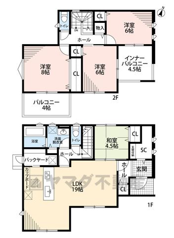 LDK19畳(1F)、和4.5畳(1F)、洋6畳(2F)、洋8畳(2F) |