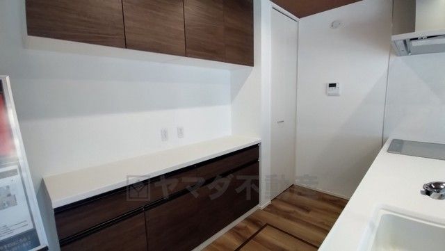 キッチンの背面には大型のカップボードが設置されています。食器収納としてはもちろん、作業台や家電置き場としても使えます。