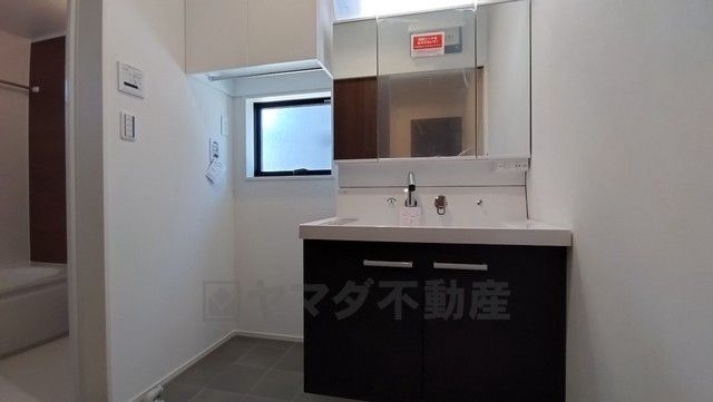 三面鏡つき洗面台。鏡裏にたっぷりとした収納スペースがあります。鏡を閉めてしまえば小物は見えないため、スッキリとした印象の洗面台にできます。