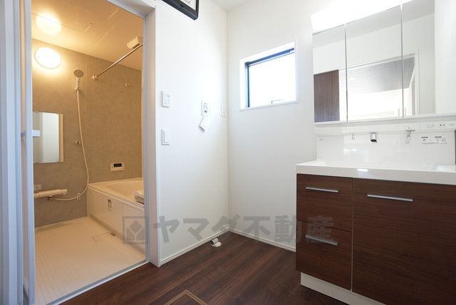 洗面台、洗濯機置き場、バスルームが連なっている、生活導線の考えられた作りになっています。
