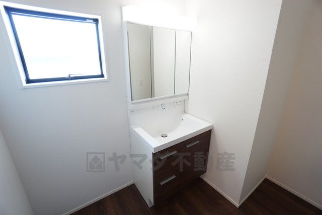 三面鏡にハンドシャワー付きで使いやすい洗面台です^^鏡裏と洗面ボウル下に収納付きの洗面台なので、整理整頓ができスッキリと使えます^^