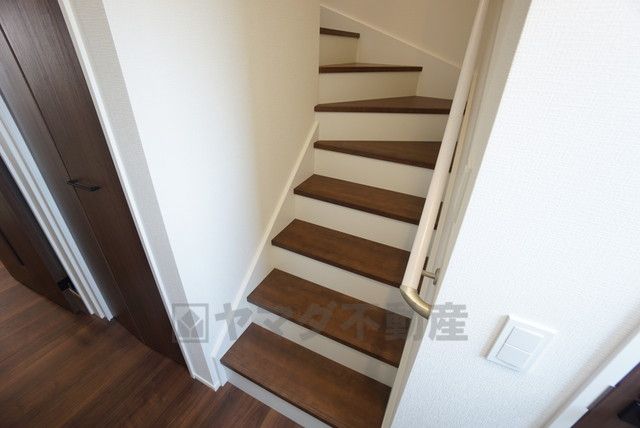 踏み場の広い手摺付き階段です。勾配も緩やかに設計されており、高齢の方でも安心できますね^^