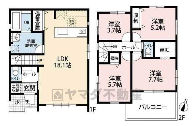 LDK18.1畳(1F)、洋7.7畳(2F)、洋5.7畳(2F)、洋5.2畳(2F)、洋3.7畳(2F) |