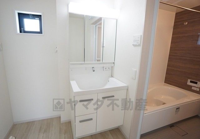 三面鏡にハンドシャワー付きで使いやすい洗面台です^^鏡裏と洗面ボウル下に収納付きの洗面台なので、整理整頓ができスッキリと使えます^^