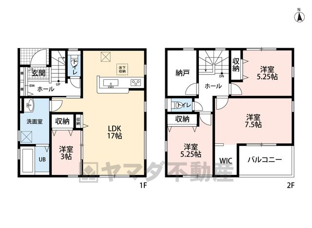 LDK17畳(1F)、洋3畳(1F)、洋5.2畳(2F)、洋7.5畳(2F)、S0畳(2F) |