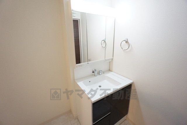 三面鏡つき洗面台。鏡裏にたっぷりとした収納スペースがあります。