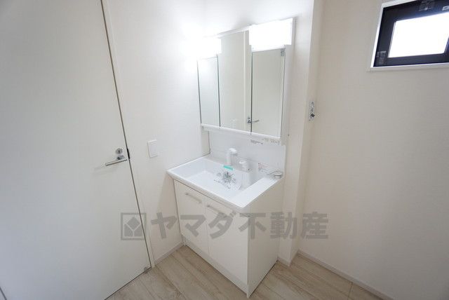 三面鏡にハンドシャワー付きで使いやすい洗面台です^^鏡裏と洗面ボウル下に収納付きの洗面台なので、整理整頓ができスッキリと使えます^^