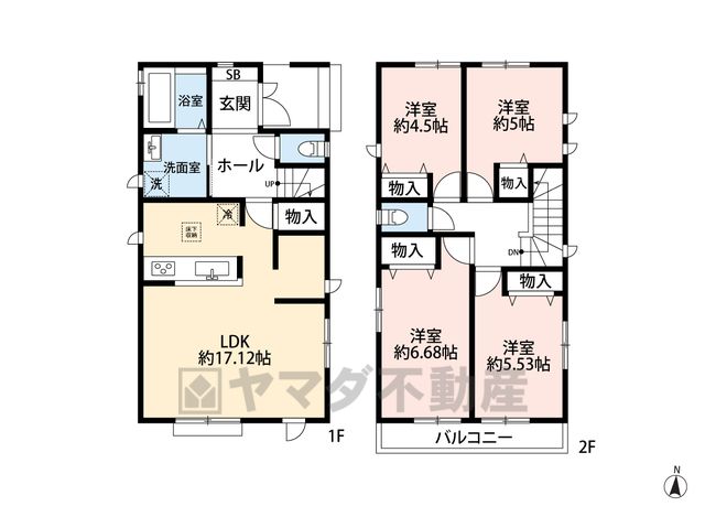 LDK17.1畳(1F)、洋6.6畳(2F)、洋5.5畳(2F)、洋5畳(2F)、洋4.5畳(2F) |