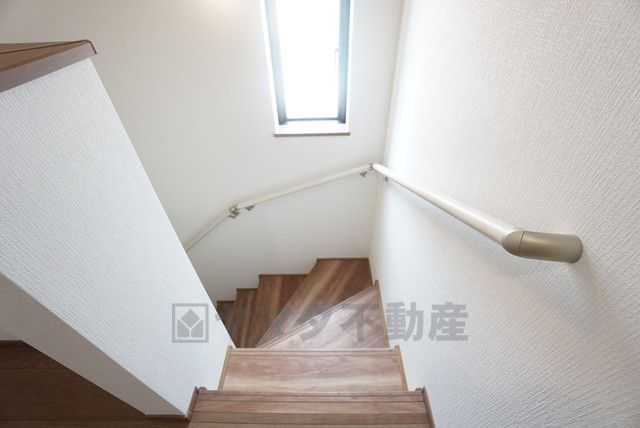 日中でも暗くなりがちな階段には、小窓を配置し採光も考えられたつくり^^手摺付きなので安全に上り下りできますね^^