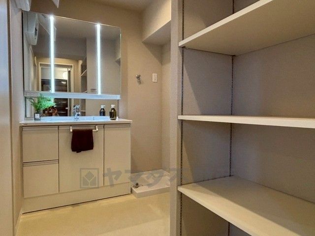 便利な洗面室収納。バスタオルや着替えを置いたり、化粧品や予備のシャンプー等もすっきりと片付けられます。