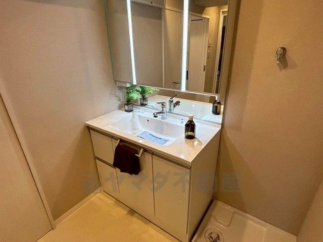 三面鏡つき洗面台。収納も一体型になっているので、化粧品や予備の歯ブラシ等もきれいに整頓できますね^^
