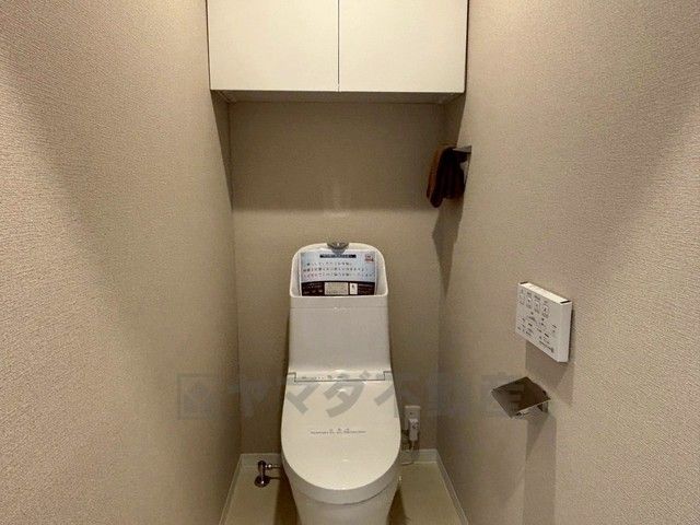 温水洗浄機付トイレです。上部には収納棚付き。トイレットペーパーや清掃用品もすっきりと整理できます^^