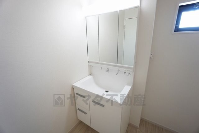 三面鏡にハンドシャワー付きで使いやすい洗面台です^^鏡裏と洗面ボウル下に収納付きの洗面台なので、整理整頓ができスッキリと使えます^^