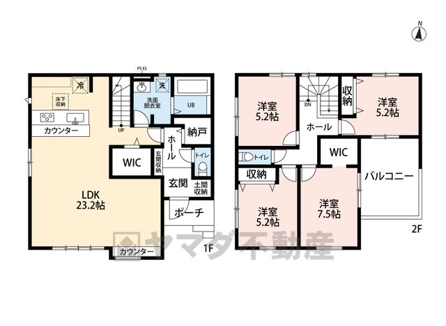 LDK23.2畳(1F)、洋7.5畳(2F)、洋5.2畳(2F) |