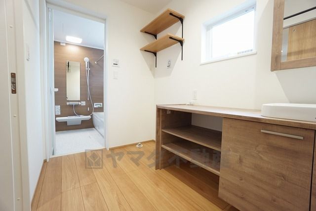 洗面台、洗濯機置き場、バスルームが連なっている、生活導線の考えられた作りになっています。