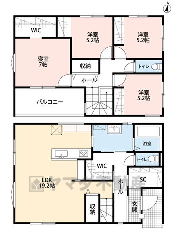 LDK19.2畳(1F)、洋7畳(2F)、洋5.2畳(2F) |