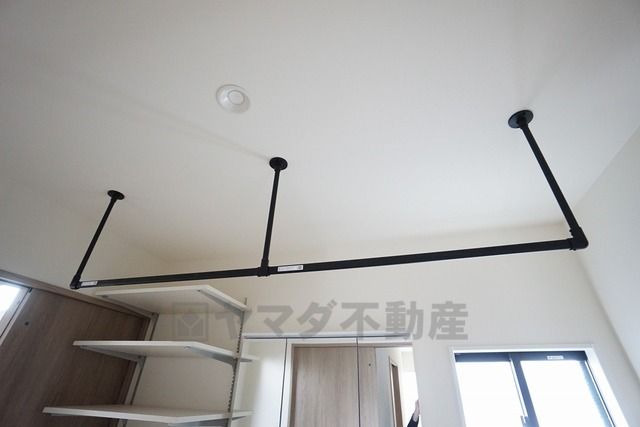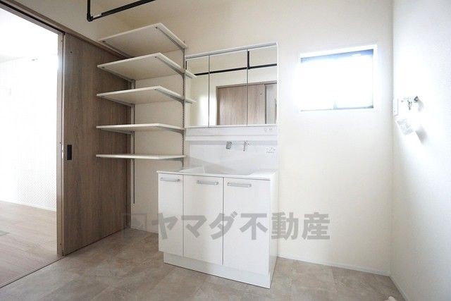 洗面室に可動棚・ハンガーパイプ付き^^リネン類やシャンプー、洗剤の収納、ランドリースペースとしても活躍してくれそうです^^