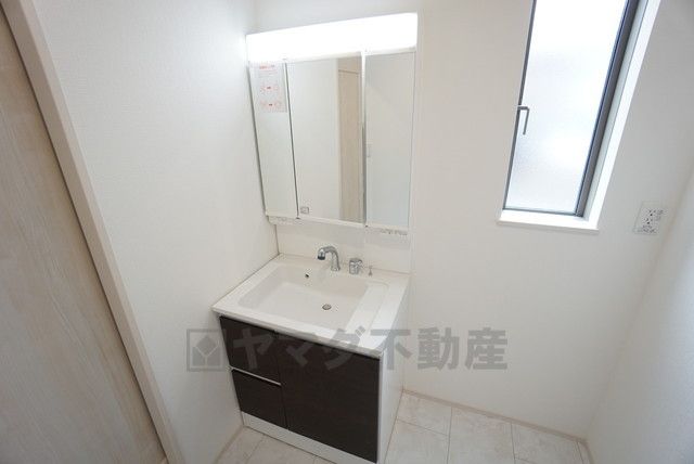 三面鏡にハンドシャワー付きで使いやすい洗面台です^^鏡裏と洗面ボウル下に収納付きの洗面台なので、整理整頓ができスッキリと使えます^^