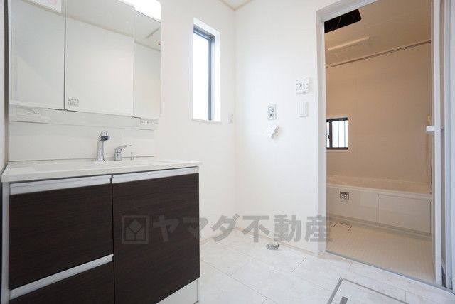 洗面台、洗濯機置き場、バスルームが連なっている、生活導線の考えられた作りになっています。