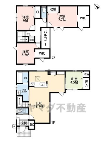 LDK18.7畳(1F)、和4.5畳(1F)、洋7.7畳(2F)、洋5.7畳(2F) |