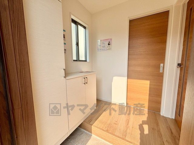 玄関扉から光の差し込む明るい玄関です。 たっぷり収納できるシューズボックス付きなので、家族全員の靴がきれいに整頓できます。