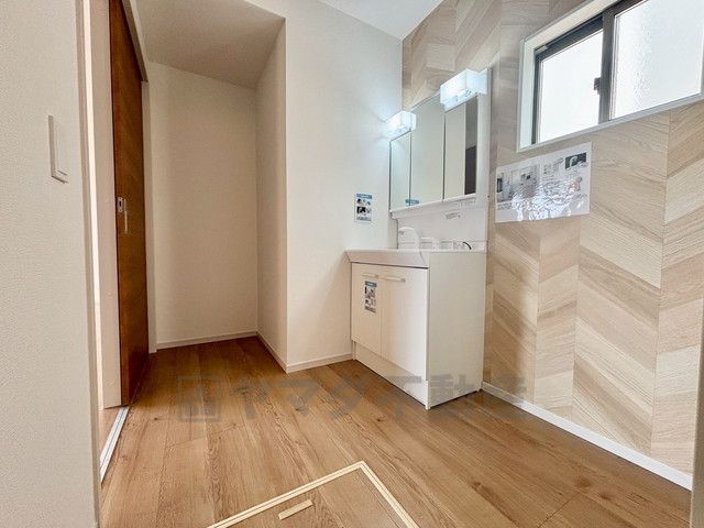 洗面台、洗濯機置き場、バスルームが連なっている、生活導線の考えられた作りになっています。窓付きなので換気もしっかりできます。