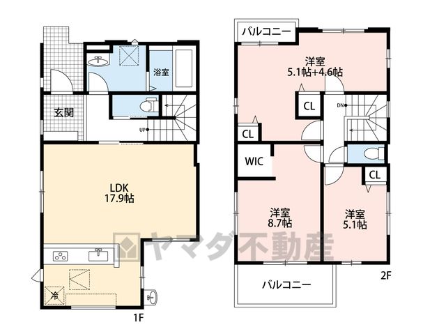 LDK17.9畳(1F)、洋9.7畳(2F)、洋8.7畳(2F)、洋5.1畳(2F) |
